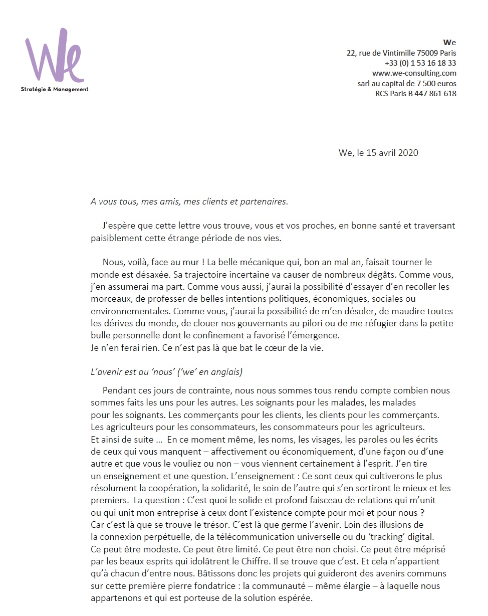 Le 15 avril dernier, au creux du premier confinement, j’envoyais une lettre personnelle à mes amis, mes clients, mes partenaires. Une lettre que je voulais de saine et lucide espérance, un pied de nez à la poisseuse tristesse qui continue de nous envahir insidieusement. Je suis retombé dessus au détour du classement de mes fichiers digitaux. Elle m’a paru encore et toujours d’actualité. Elle pourrait même vous donner des idées, ouvrir chez vous une porte trop vite refermée, donner un point d’appui à votre audace, car il n’est plus temps de faire comme si de rien n’était ou vous n’étiez pas concerné. Je me permets de la partager avec vous.